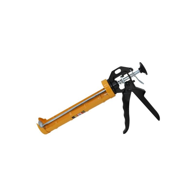 Pistola in acciaio con sistema classico di avanzamento e scarico per tubi di silicone/colla/mastice. Dimensioni: 330 mm.