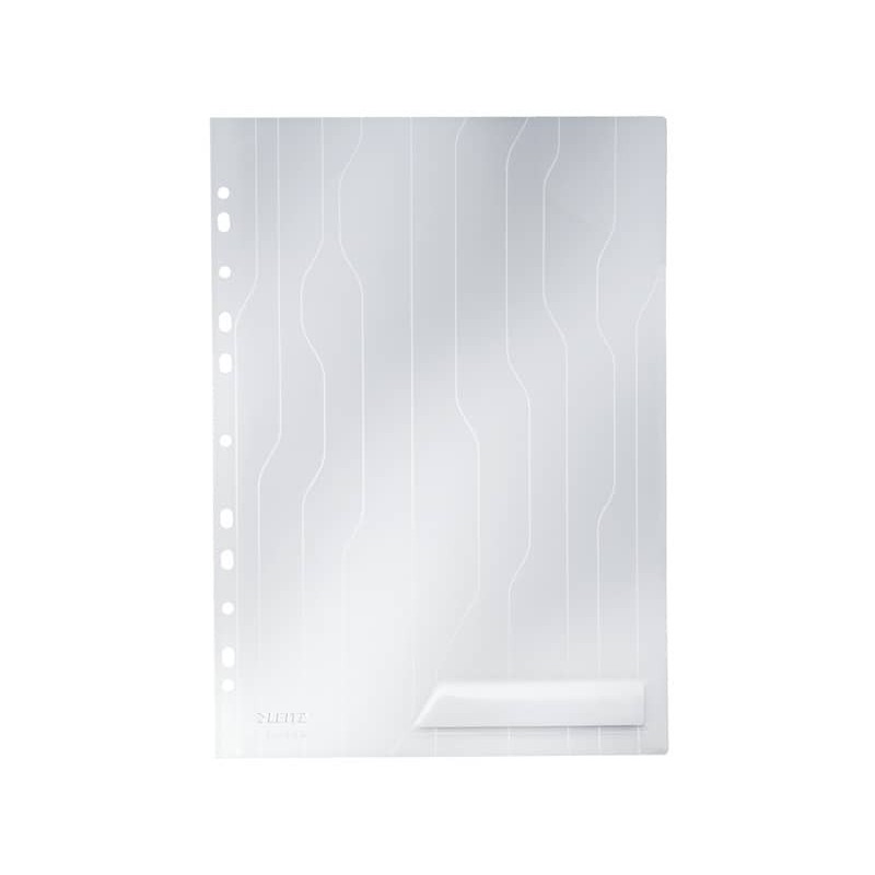 Busta e tasca flessibile con esclusiva etichetta per archiviazione perforata pieghevole. I documenti restano ben fermi grazie a una tasca angolare che fissa la copertina anteriore e a una sigillatura parziale sul lato in basso a destra. Design attraente dalla finitura goffrata su foglio in PP.