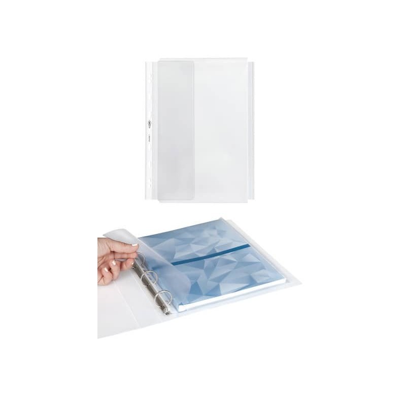 Buste con soffietto e patella laterale di chiusura in PP buccia, altissima capacità di contenuto, con foratura universale rinforzata. Contenuto fino a 100 fogli. Confezione da 10 pezzi.
