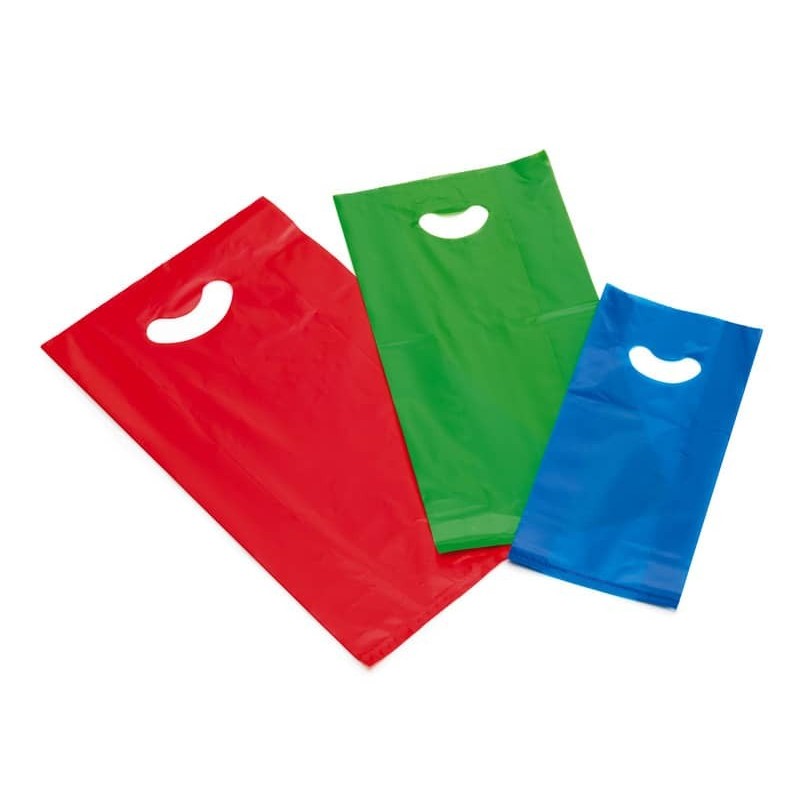 Buste Smiling Bag con manico a fagiolo e soffietto laterale, 100% riciclabili. In pratica scatola trasparente da 5 colori assortiti: verde, giallo, fucsia, rosso e blu. Riutilizzabili secondo normativa vigente. Materiale: polietilene alta densità (PE-HD) con spessore 60 ?m. Formato 20+5+5x42 cm. Confezione da 125 buste.