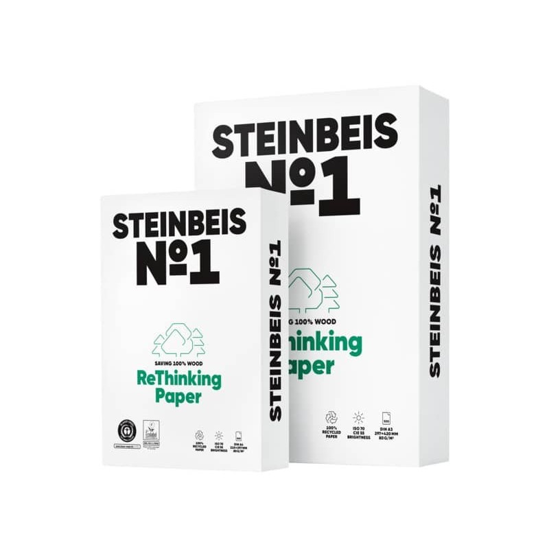 Steinbeis No. 1 è ottenuta al 100% da carta riciclata senza l?impiego di cloro o candeggianti al cloro. La carta è certificata secondo gli standard ecologici Blue Angel ed EU-Ecolabel. Al termine del suo uso, la carta può essere riciclata per intero. Steinbeis No. 1 è adatta a qualsiasi stampante laser e a getto d?inchiostro comune. Le fibre ecosostenibili della materia prima e il processo di produzione all?interno di una fabbrica integrata, fanno di questo prodotto l?alternativa ecologica alle carte con fibre vergini. Formato A4. Grammatura 80 g/m². Spessore 102 ?m. Grado di bianco CIE 55. Opacità >95%. Risma da 500 fogli.