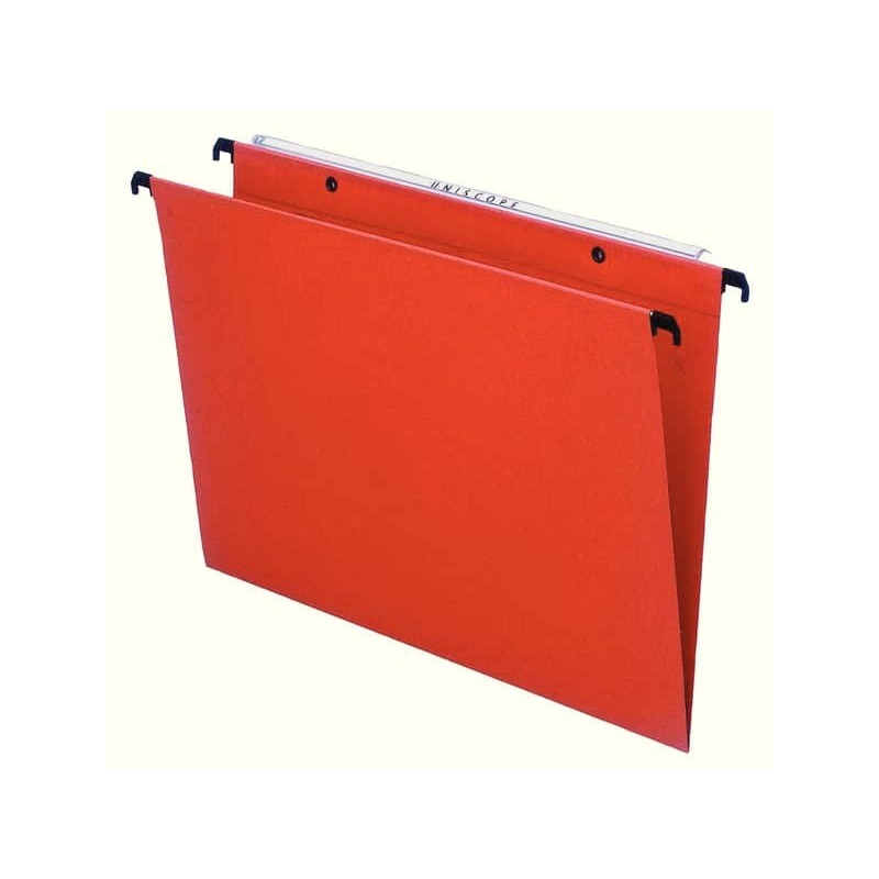 Cartella a lettura superiore per cassetti in robusto cartoncino orange kraft. Ganci di sostegno in nylon con astina in acciaio fissati alla cartella con incollatura Hot Melt. Portacartellino Scope già montato. Interasse mm 330, fondo mm 30.
