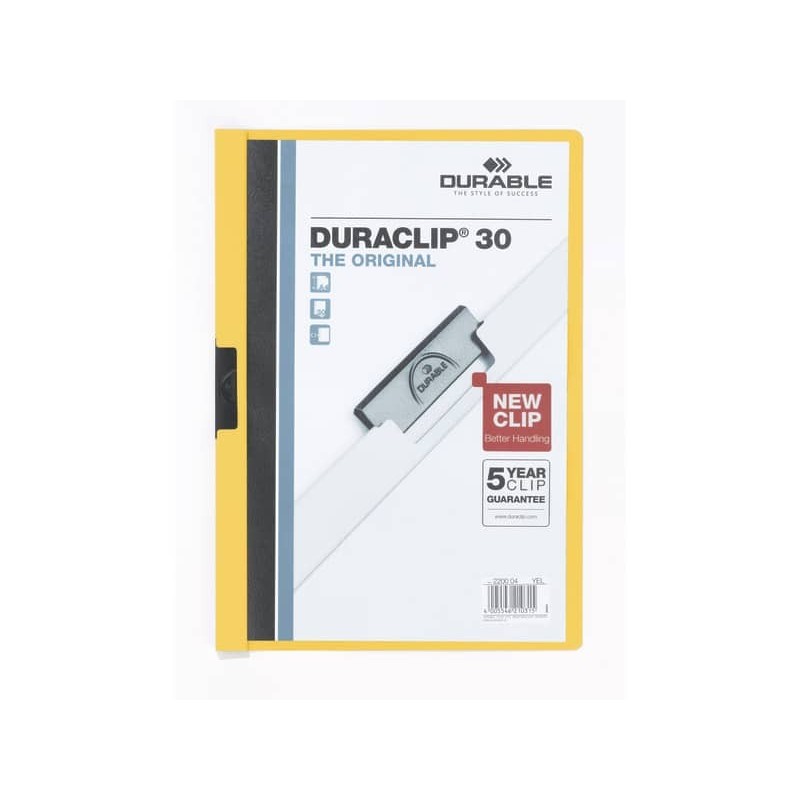 L'originale cartellina con clip inventata e brevettata da DURABLE nel 1959 e prodotta in Germania. Cartellina realizzata in PVC di alta qualità con clip in acciaio, copertina trasparente e retro colorato. La clip si adatta al numero di fogli inseriti e il suo perfetto funzionamento è garantito 5 anni. Ideale per presentare e archiviare, in modo professionale, documenti non perforati: tira la clip - inserisci i documenti - riposiziona la clip - semplice! Con DURACLIP® i tuoi fascicoli avranno sempre un aspetto professionale, ordinato e organizzato. Capacità 1-30 fogli formato A4. Colore giallo.