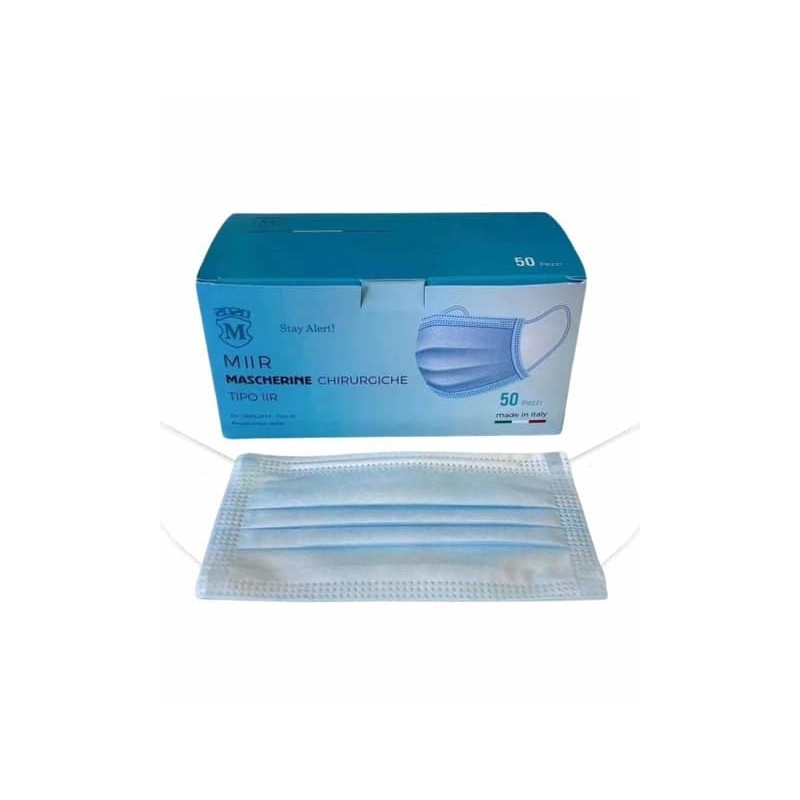 Mascherine chirurgiche monouso tipo IIR. Colore azzurro. Dotate di nasello modellabile per essere adattato alla forma anatomica del viso ed elastici per agganciare la mascherina dietro le orecchie. Disponbibili in N° 5 confezioni da 10 pezzi. La mascherina monouso con elastici è composta da 3 strati: strato esterno in spunbond in PP, strato filtrante in PP meltblown, strato interno in spunbond in PP. Dispositivo classificato come dispositivo medico di Classe I. Dispositivo di tipo IIR conforme alla norma UNI EN 14683:2019 e alle norme UNI EN ISO 10993-2010.