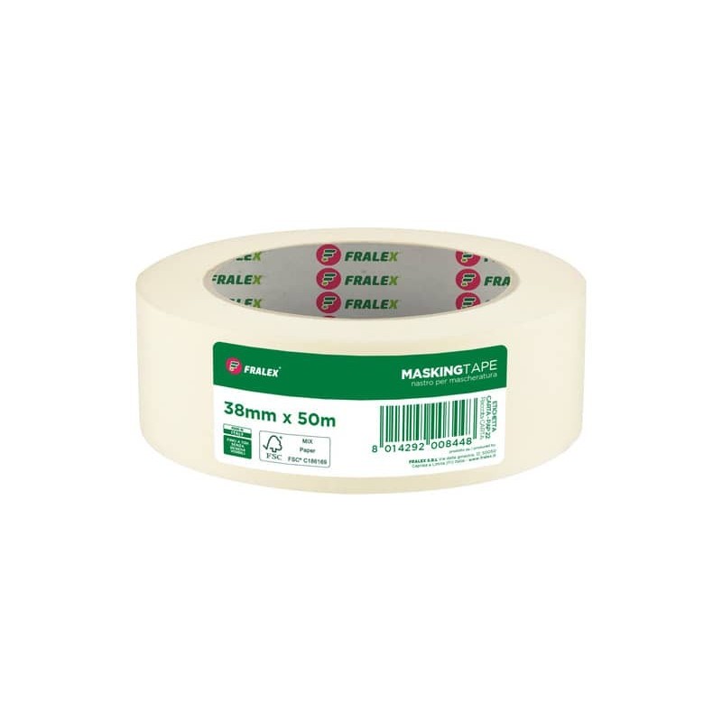 Nastro per mascheratura in carta colore avorio. Anima Fralex. FSC credit mix COC C186169. Dimensioni: 38 mm x 50 m. Carta mista FSC. Ideale per mascherature generiche. Utilizzabile fino a 60 °C. Adatto per mascheratura di pittura per interni quali: pareti, legno, metallo e mobili. Rimovibile fino a 4 giorni senza lasciare nessun residuo.