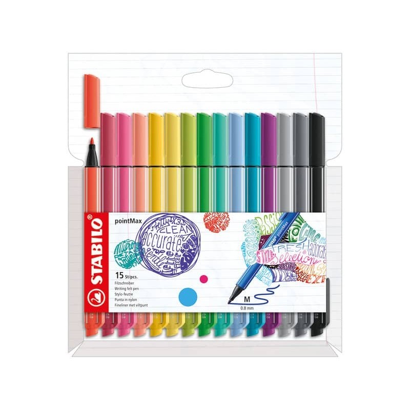 Pennarelli Stabilo PointMax Fineliner Premium con punta nylon ''L'' da 0.8 mm. Resiste fino a 24 ore senza cappuccio. Inchiostro inodore a base d'acqua. Dotato di comoda clip. Astuccio appendibile con 15 colori: 488/5 - giallo chiaro, 488/7 - corallo, 488/11 - blu ghiaccio, 488/13 - verde ghiaccio, 488/14 - lime, 488/26 - albicocca, 488/29 -rosa chiaro, 488/31 - azzurro chiaro, 488/43 - verde foglia, 488/44 - giallo, 488/46 - nero, 488/49 - rosso fragola, 488/58 - lilla, 488/94 - grigio freddo chiaro, 488/96 - grigio scuro.
