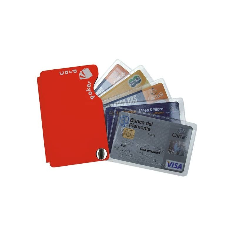Portacarte Pokercard a 5 scomparti con disposizione a ventaglio in PVC gommato e anima semirigida. Interni in PVC cristal, rivetto in metallo, stampa a caldo. Colore rosso.
