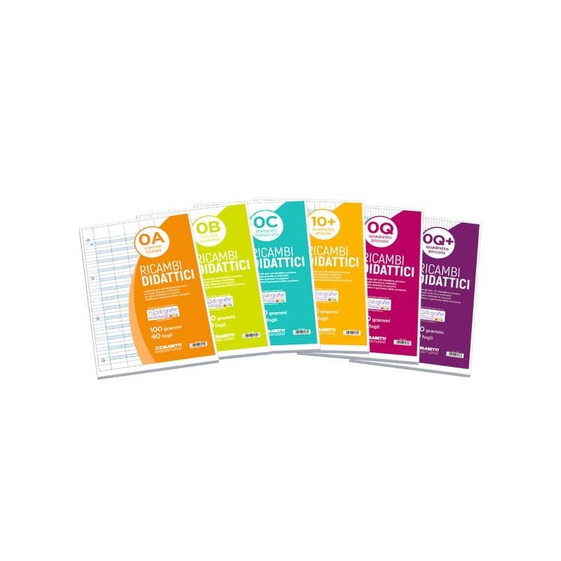 Ricambi Didattici per quaderni ad anelli con banda rinforzata in PVC antistrappo. Studiati appositamente per disgrafia. Sono realizzati in formato A4 in carta da 100 grammi. 40 fogli. Questo articolo è prodotto con energia solare, è certificato Federottica ed è testato e approvato dall?Associazione Europea Disgrafie.