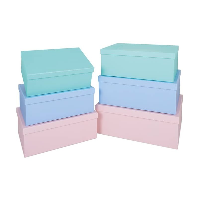 Set composto da 6 robuste scatole in cartone rivestito in carta plastificata opaca in 3 colori pastel. Disponibili 6 formati: 29x21x11 cm, 31x25x11,8 cm, 33x24x12,5 cm, 35x26x13 cm, 37x28x13,8 cm, 39x30x14,6 cm.