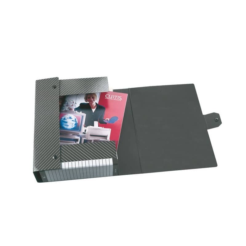 Cartelle per progetti in fibrone da 1,2 mm stampato e plastificato. Bloccaggio e chiusura dei lembi mediante bottoni a pressione. La stampa della superficie di scrittura su due differenti dorsi consente l?archiviazione in funzione degli spazi disponibili. Come tutti gli articoli della linea Delso Line, grazie al processo di plastificazione, è possibile cancellare le scritte (con alcool o acetone) e riutilizzare nuovamente il prodotto. In fibrone stampato e plastificato, dorso 4 cm. Colore: grigio.