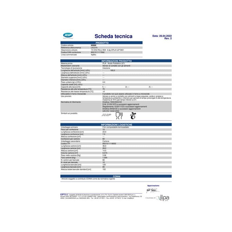 Coltelli bianchi IlipBio in PLA cristallizzato biodegradabilie e compostabile, peso 4,4 g. Confezione da 15 pezzi. Idoneo a venire a contatto con alimenti a base acquosa, acida e grassa a temperatura ambiente o inferiore per periodi di tempo prolungati e alla temperatura massima di 70°C per tempi inferiori a 2h.