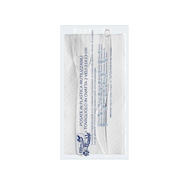 Set 2 posate reuse in polistirene trasparenti con tovagliolo. Confezione da 100 pezzi. Lunghezza: 180 mm. Peso netto unitario: 11,5 g. Contatto con alimenti: Max 70 °C per 2 ore. Non utilizzabile in forno. Prodotto riutilizzabile.