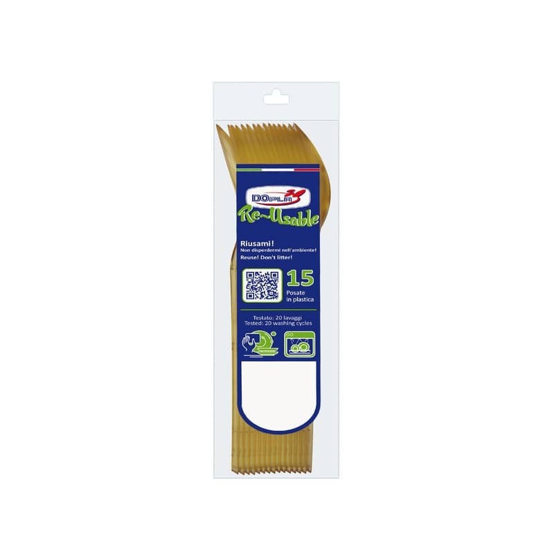 Cucchiai compact in polistirene. Colore: oro. Lunghezza: 180 mm. Idonei al contatto con alimenti fino a max 90° C per 15 minuti. Non utlizzabili in forno. Prodotti riutilizzabili. Testato 20 lavaggi in lavastoviglie. Confezione da 15 pezzi.
