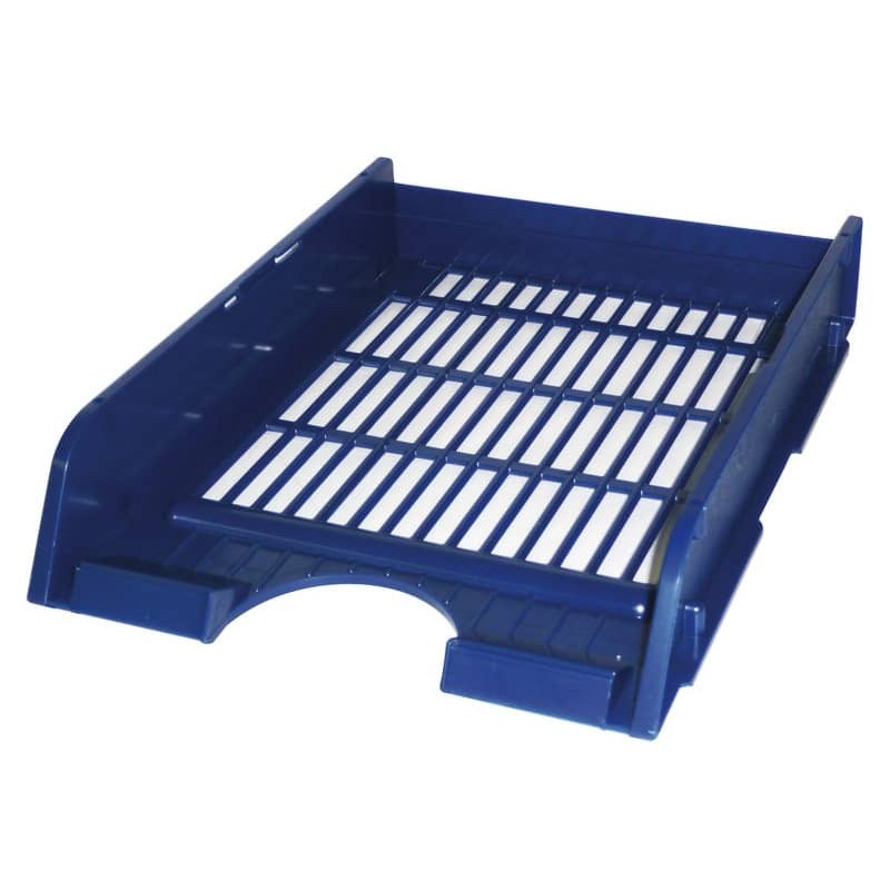 Vaschetta portacorrispondenza forata e sovrapponibile, verticalmente o a scalare, in colore blu. Resistente e affidabile, sopporta carichi pesanti senza deformarsi. La presa centrale semplifica l'accesso ai documenti, con sede per due etichette. Dimensioni 340 x 260 H. 60 mm.