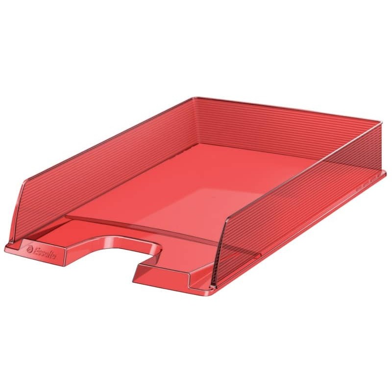 Vaschetta portacorrispondenza in polistirene 100% riciclabile, massima resistenza per resistere alla deformazione anche a pieno carico, fronte inclinato per un agevole accesso ai documenti, bordi rinforzati per una maggiore resistenza, doppio spazio per l'applicazione di etichette, sovrapponibile in linea o a sbalzo, utilizzabile con distanziatore universale per estendere l'altezza della vaschetta e massimizzarne la capienza. Confezione da 10 pezzi. Formato 25,4x6,1x35 cm, colore rosso.